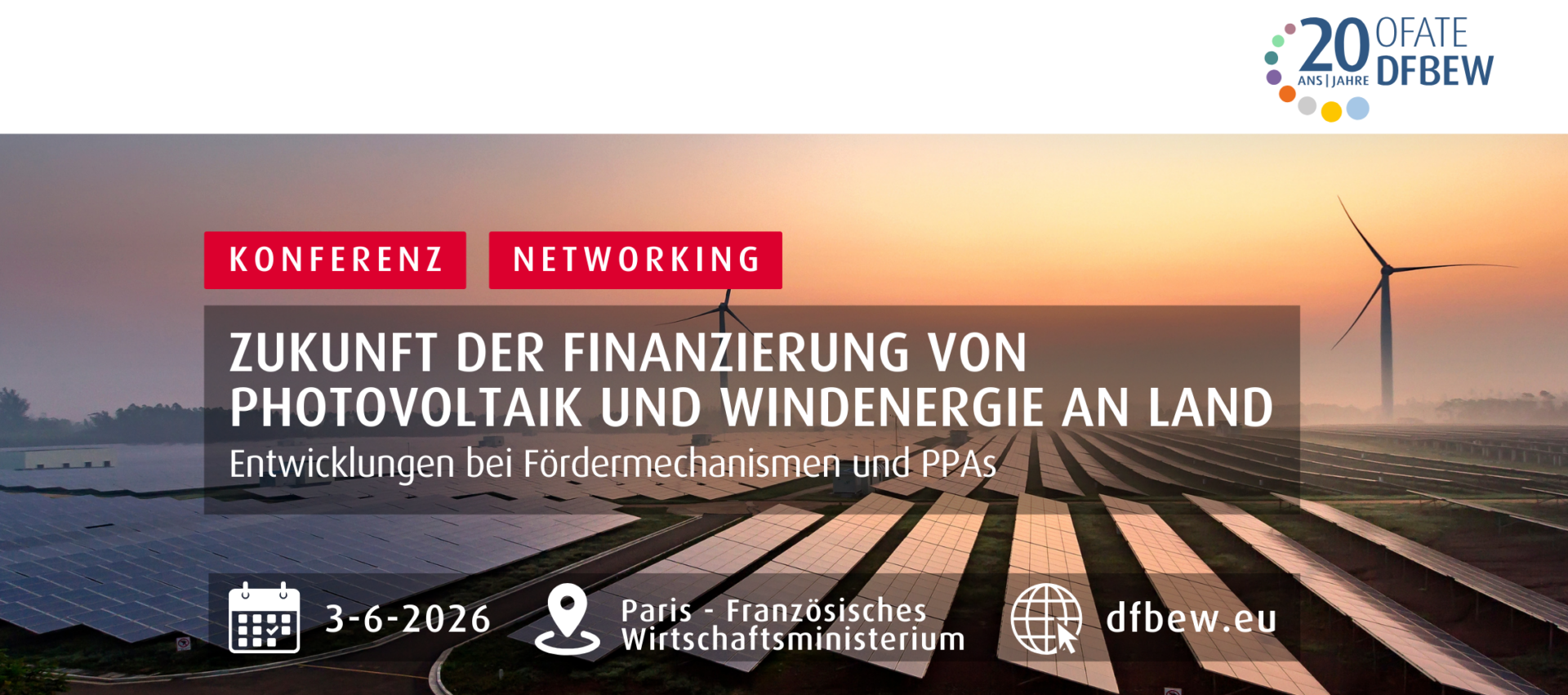 Am 3. Juni 2026 veranstaltet das deutsch-französische Büro für die Energiewende (DFBEW) eine Konferenz in Paris zum Thema: Zukunft der Finanzierung von PV und Windenergie an Land: ...